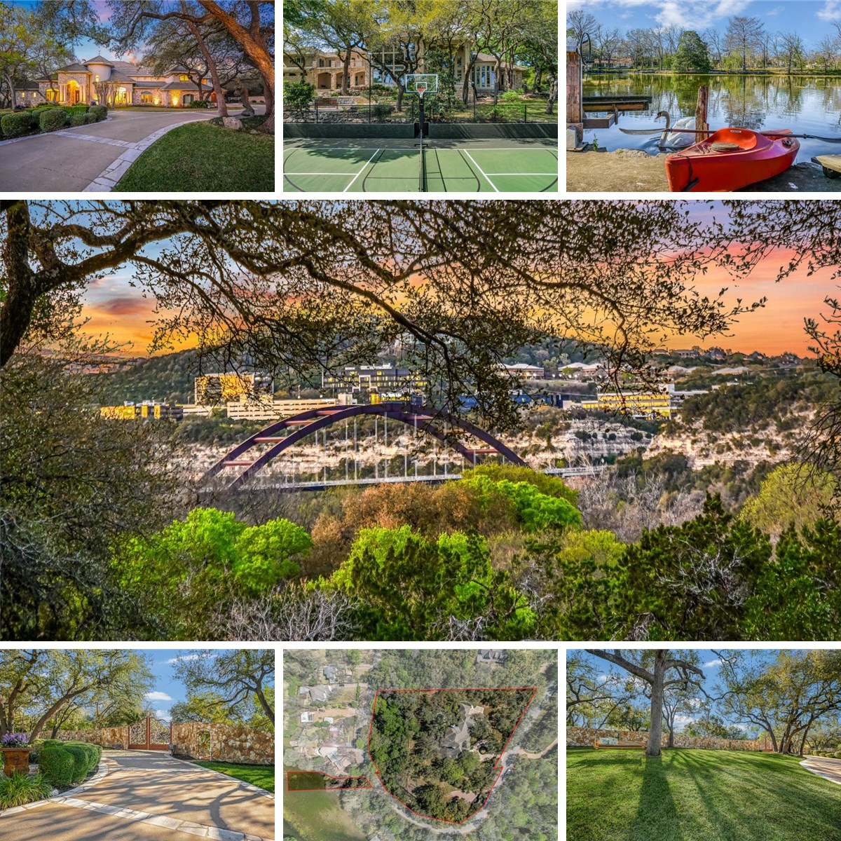 Designed for expansive living, the estate includes four additional en-suite bedrooms, a dedicated home gym, and an oversized four-car garage equipped with a 50-amp EV power outlet. Comfort and efficiency are elevated with newly installed Lennox dual-fuel HVAC systems and the option for a separate water treatment enhancement system. Outdoor living is equally impressive. Two sprawling covered patios overlook a resort-style setting complete with a heated pool, spa, stream, and waterfall features. A newly constructed, oversized lighted pickleball court offers recreation day or night, while panoramic views stretch across the Hill Country to the iconic Pennybacker Bridge in the distance.